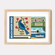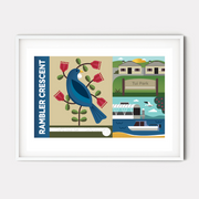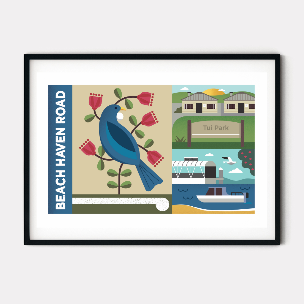 Inspired by our local area. This Beach Haven artwork celebrates some of our local landmarks wildlife that we are lucky to see and hear in our neighbourhood.