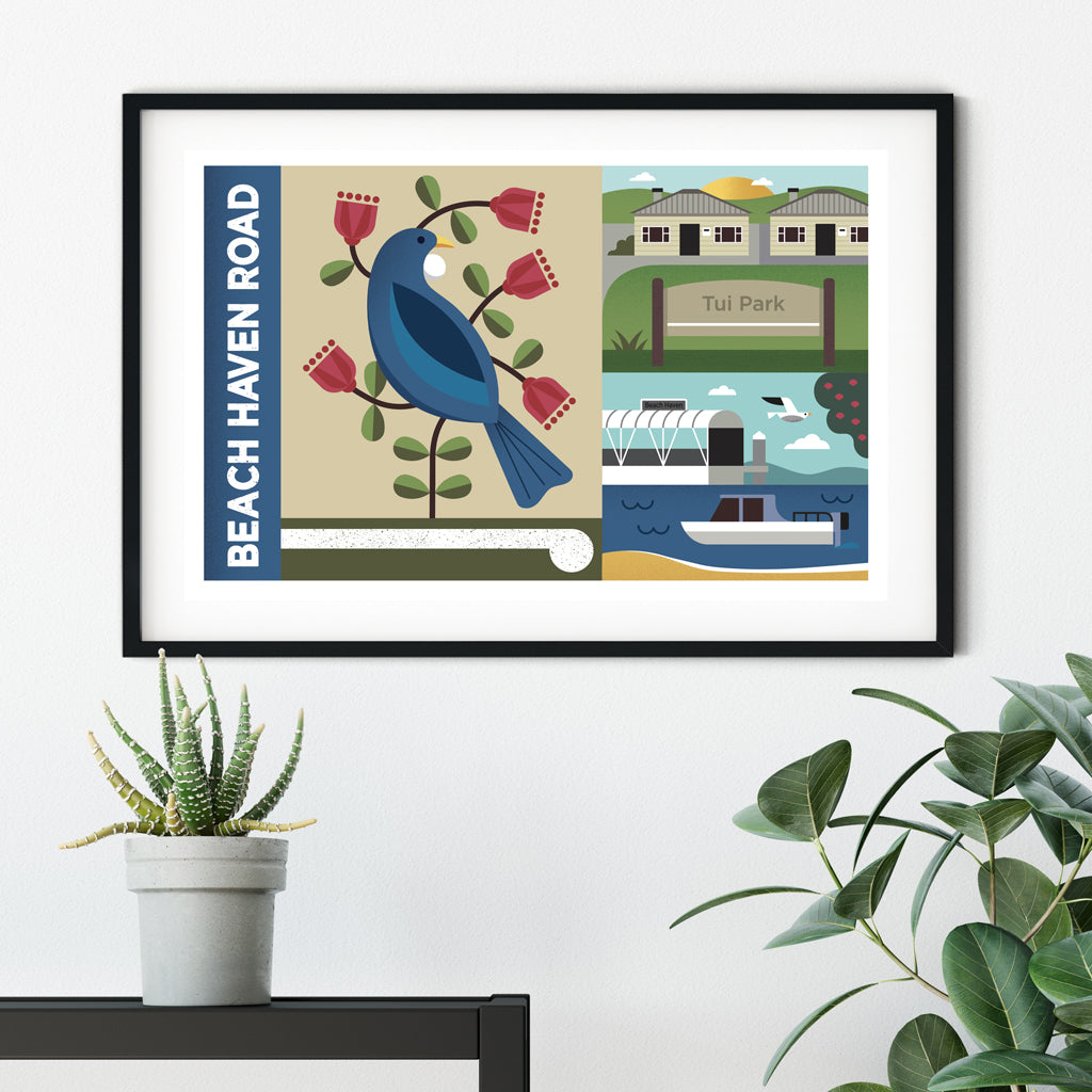 Standard print features road name 'Beach Haven Road' but we offer free customisation to include your own road name.