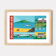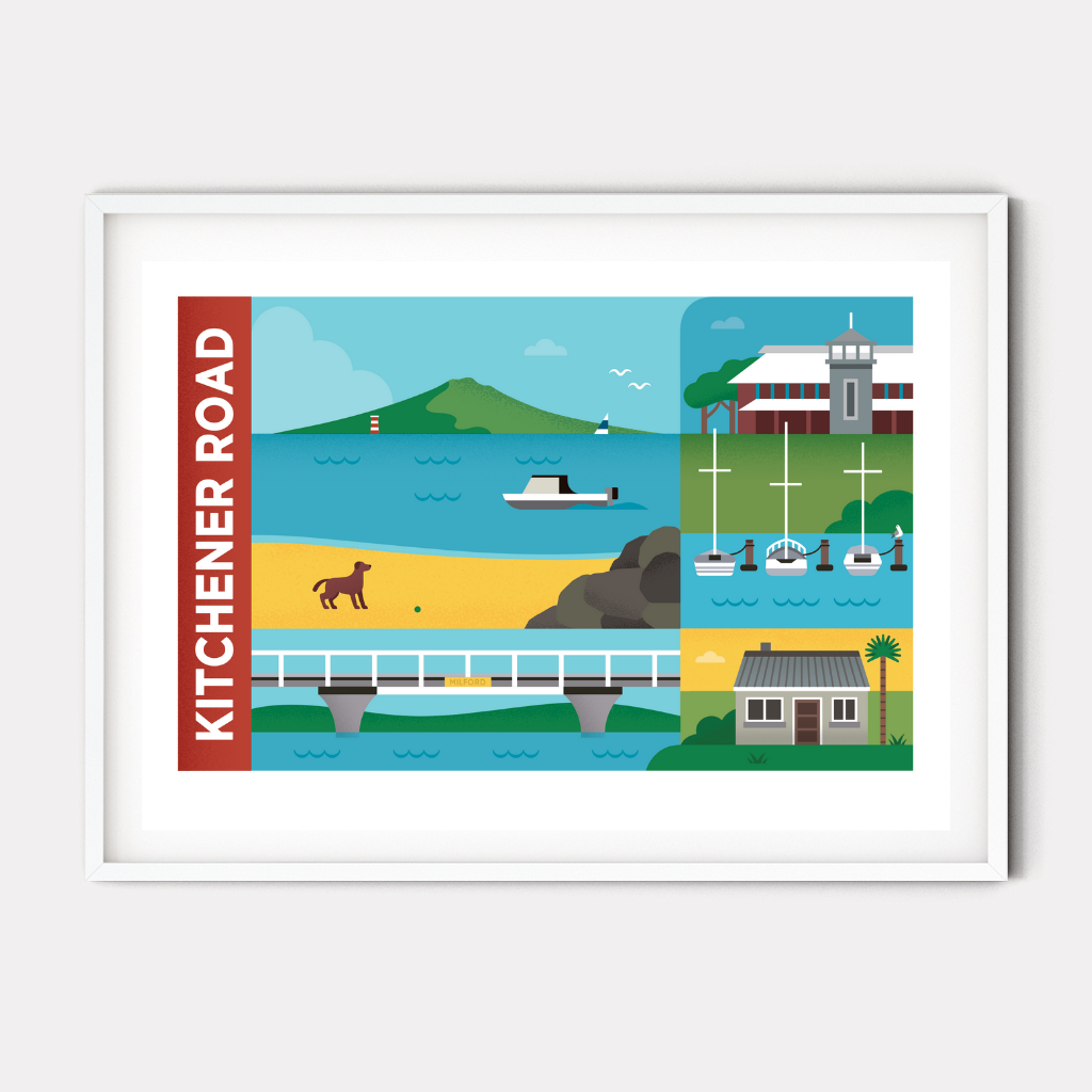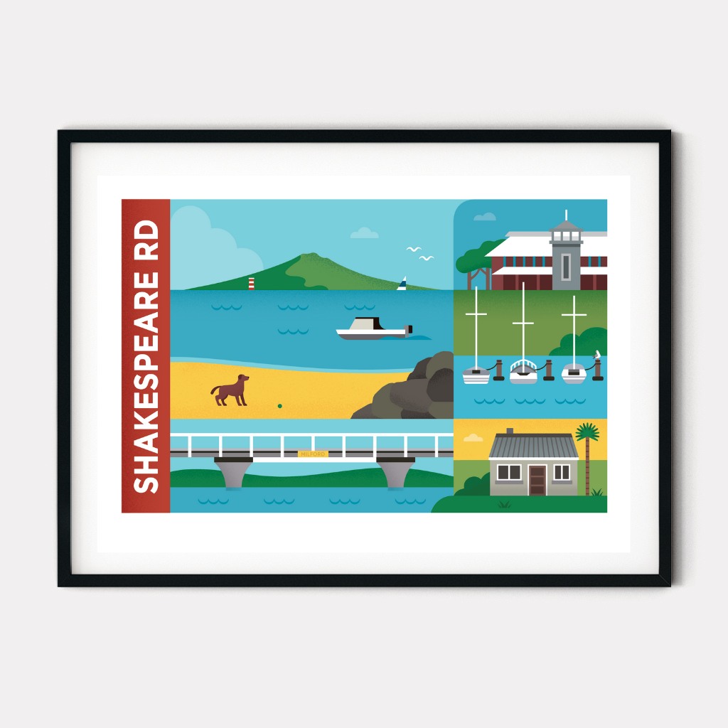 Standard print features 'Milford Road' but we offer free to include your own road name or place name, ie 'Kitchener Road, Shakespear Road' or just 'Milford Beach'