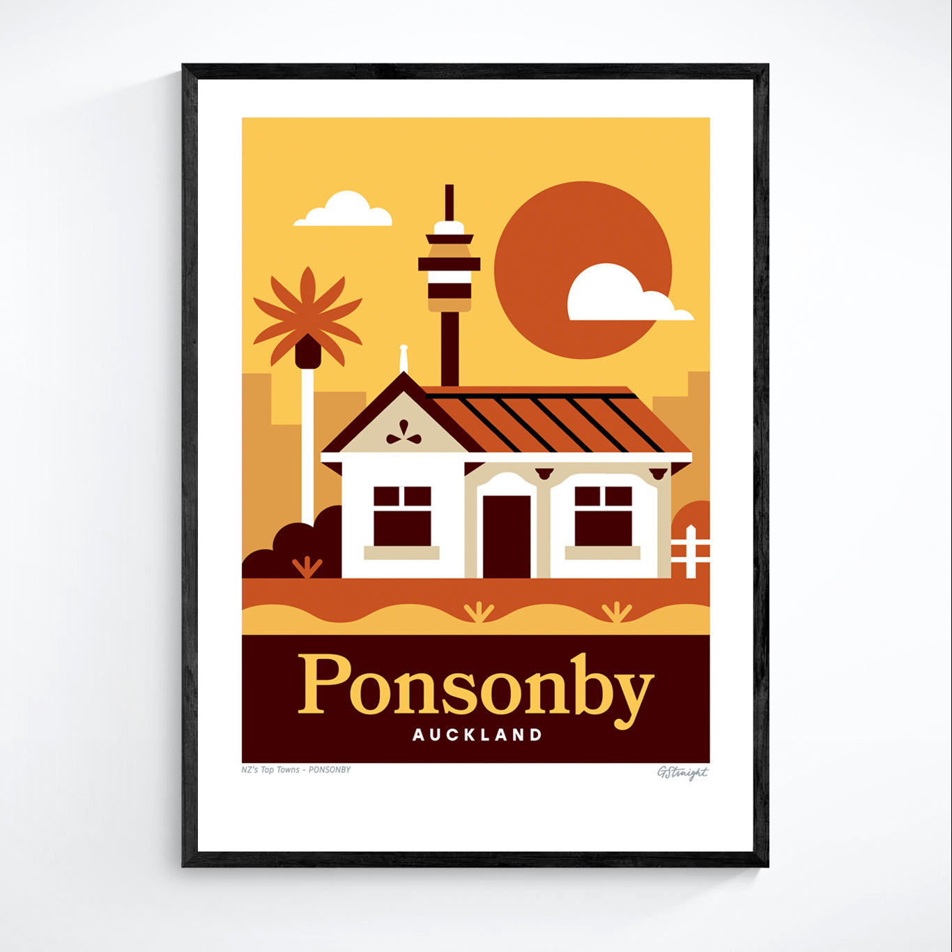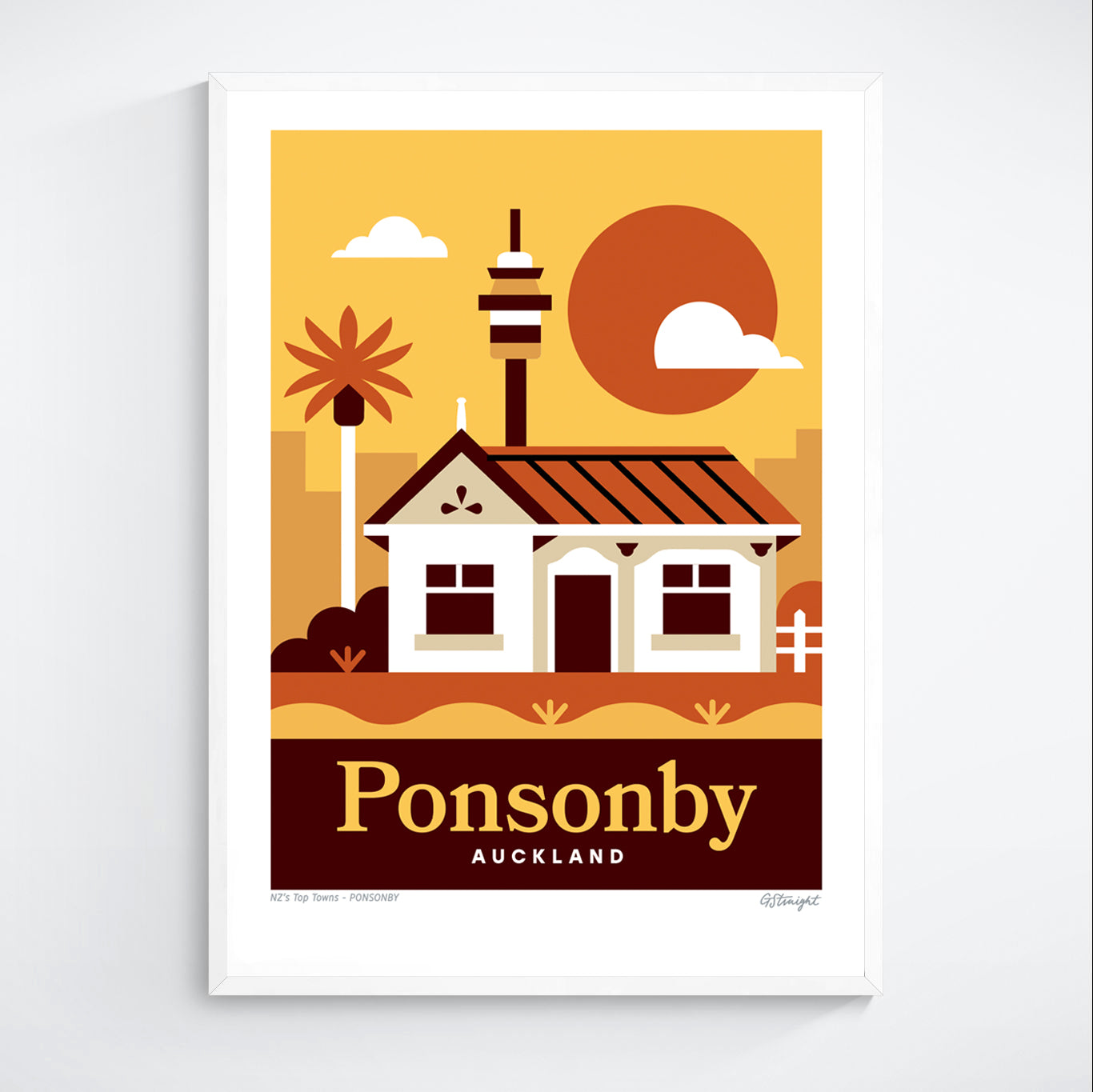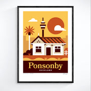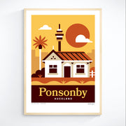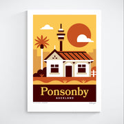 This Ponsonby art print captures one of Auckland’s most iconic suburbs, featuring classic villa architecture with the city skyline rising behind. It reflects Ponsonby’s blend of heritage charm, urban energy, and inner-city lifestyle.