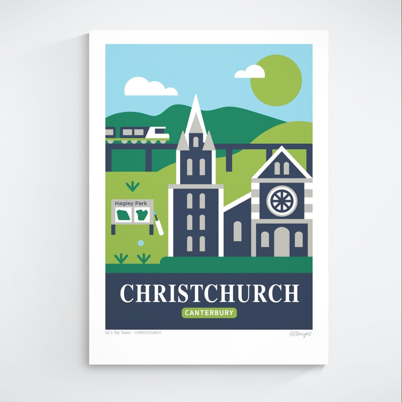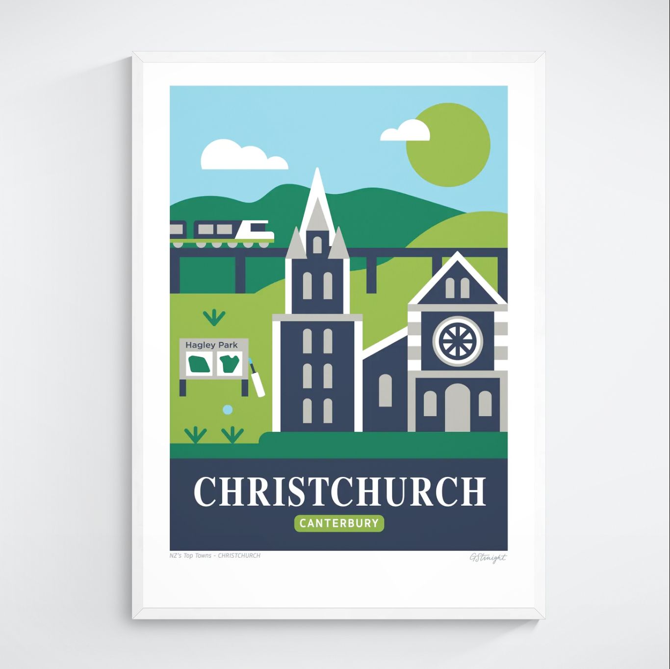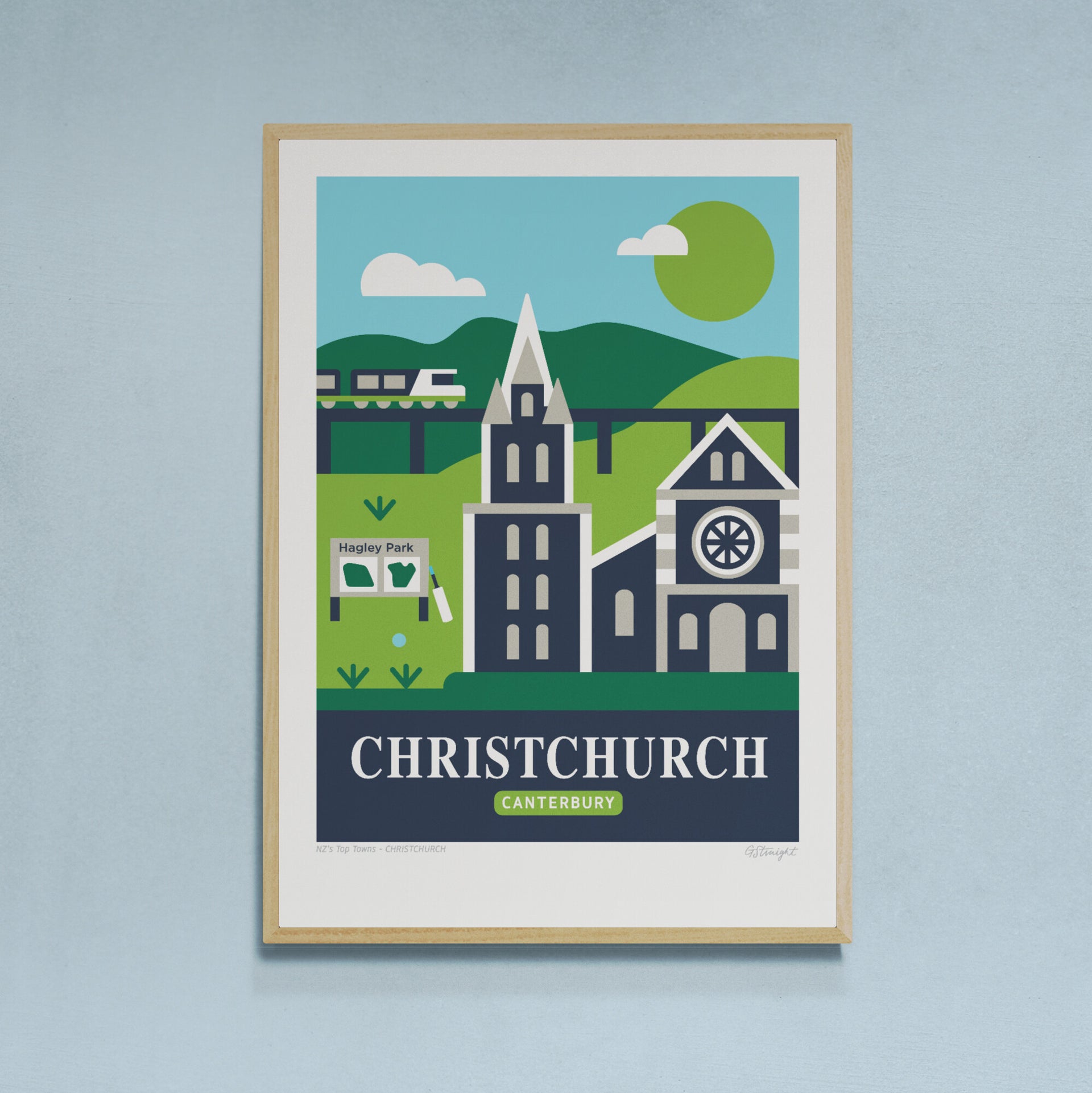 This Christchurch art print captures the essence of the South Island’s largest city. Featuring the famous Cathedral, Hagley Park and the iconic TranzAlpine train. This artwork reflects Christchurch’s character and resilience.