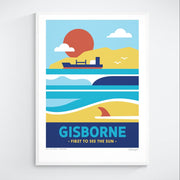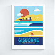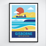 This Gisborne art print showcases the East Coast’s magic, featuring a glowing sunset, a single-fin surfboard, breaking waves with seagulls overhead, and Young Nicks Head — the first place to see the sun. It captures the warmth of Tairāwhiti.