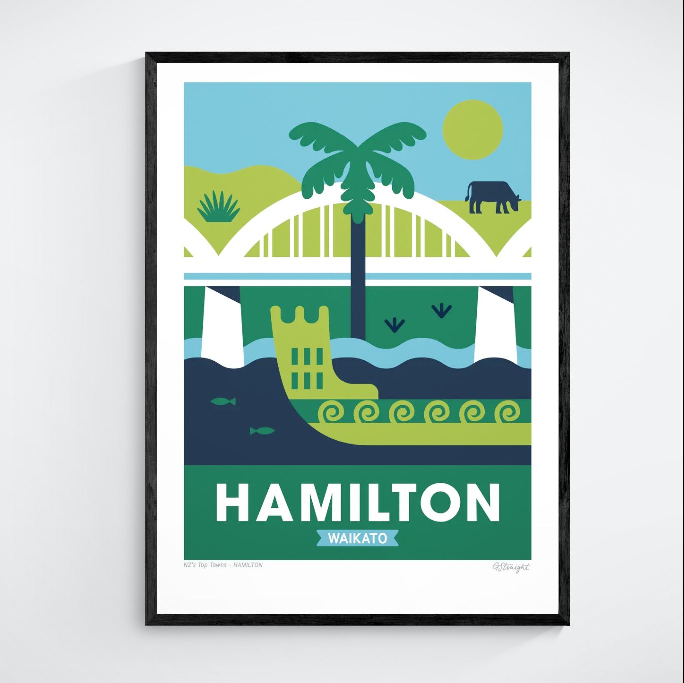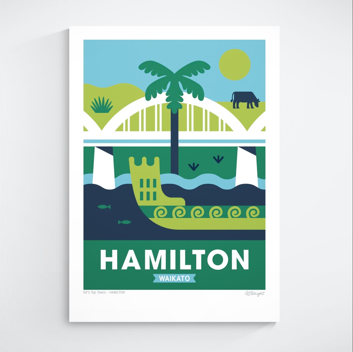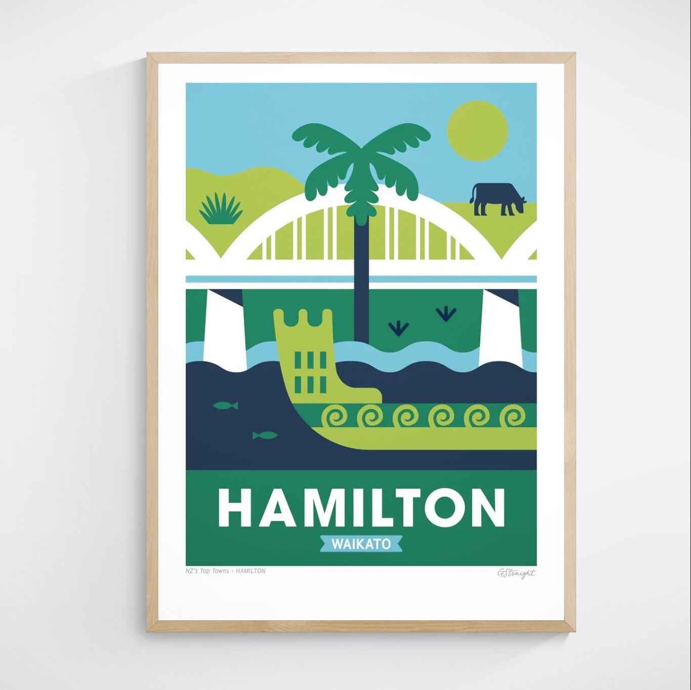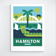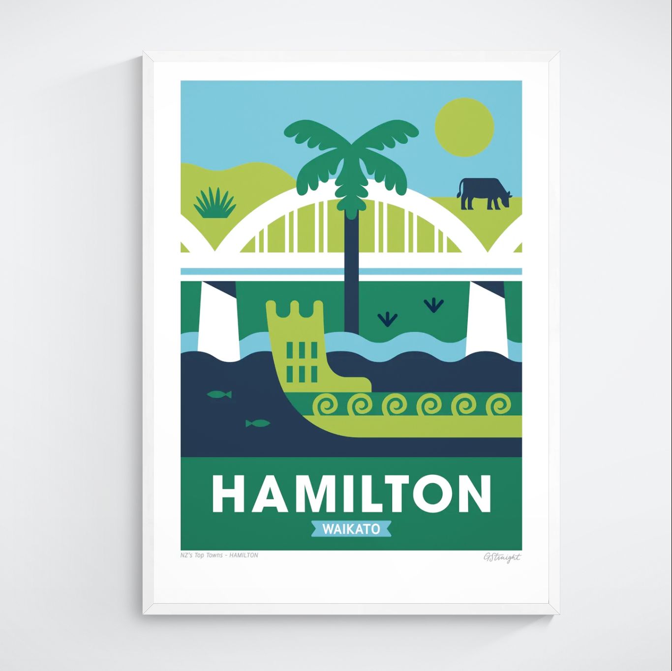 This Hamilton art print highlights the character of the Mighty Waikato. Featuring the iconic Victoria Bridge, a traditional waka gliding on the Waikato River, and the rolling farmland dotted with cows, capturing the essence of the region’s cultural heritage and rural charm.