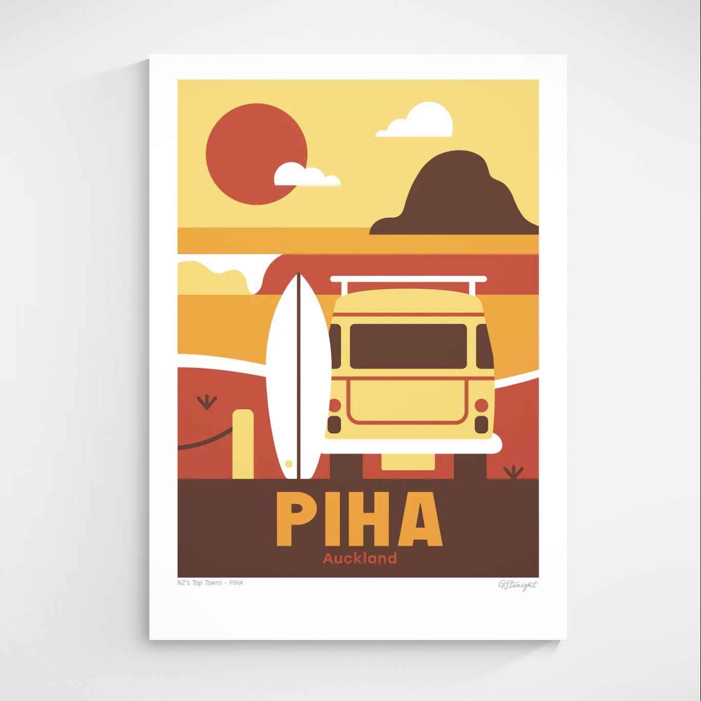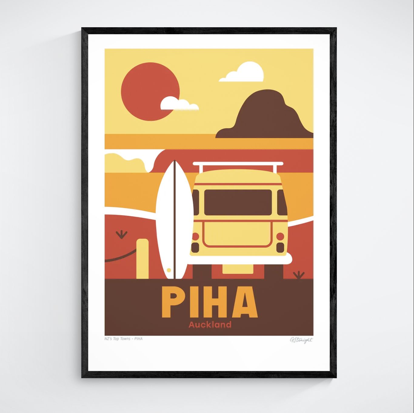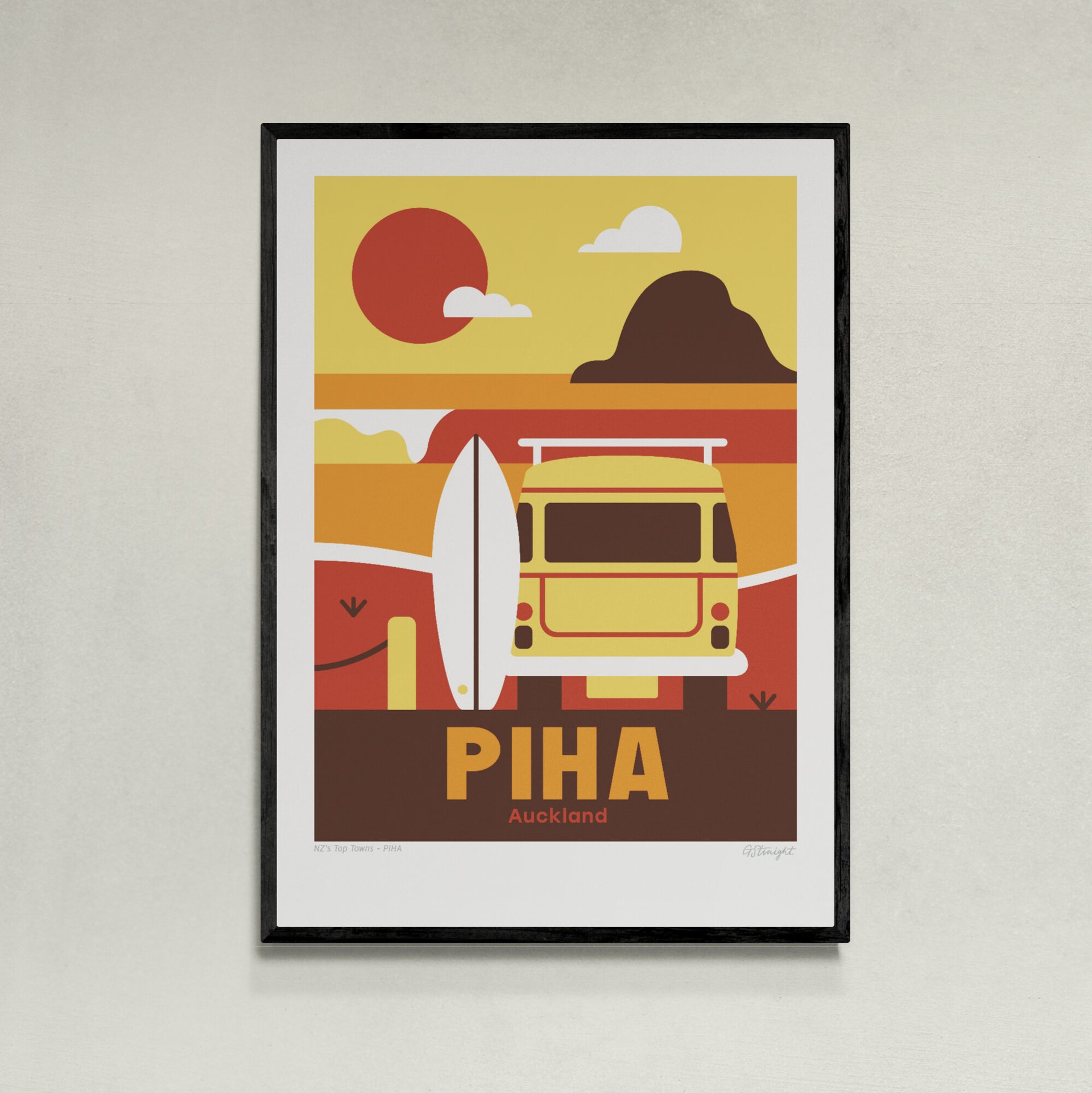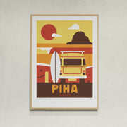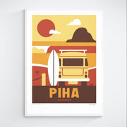 This Piha art print captures the rugged beauty of Auckland’s west coast, featuring a surfboard, the iconic Lion Rock, a VW combi van, and a left-hand wave breaking on the bar. It reflects Piha’s legendary surf and wild charm.