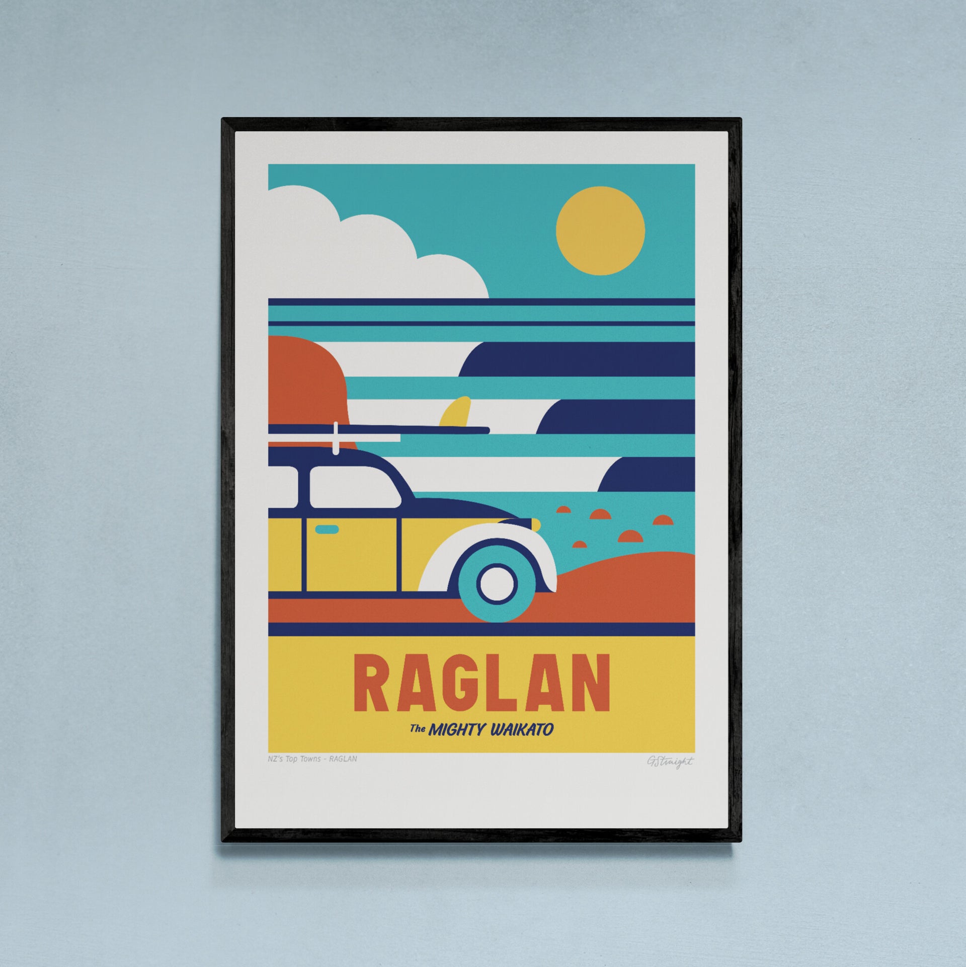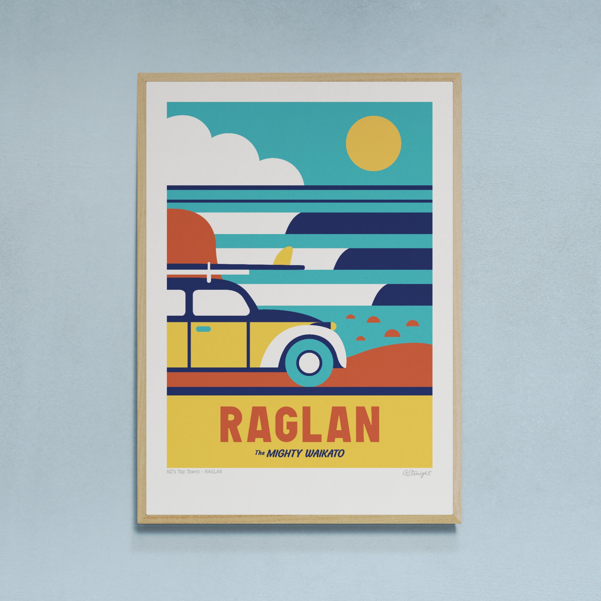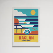 This Raglan art print captures the town’s legendary surf culture, featuring the world-class left-hand point break, a vintage VW Beetle, and the laid-back vibe of New Zealand’s surfers paradise. It’s a perfect celebration of Raglan’s coastal spirit.
