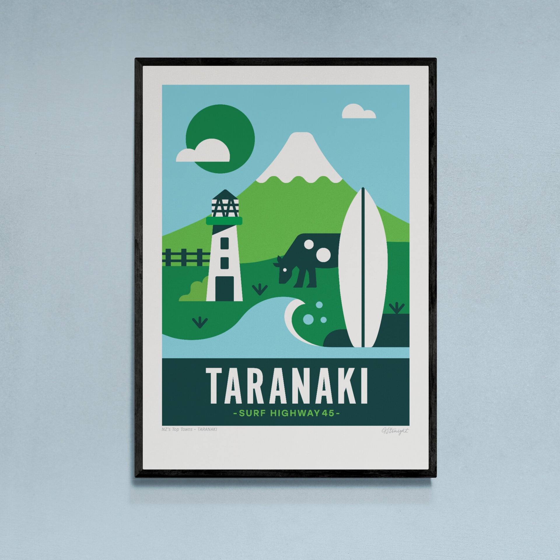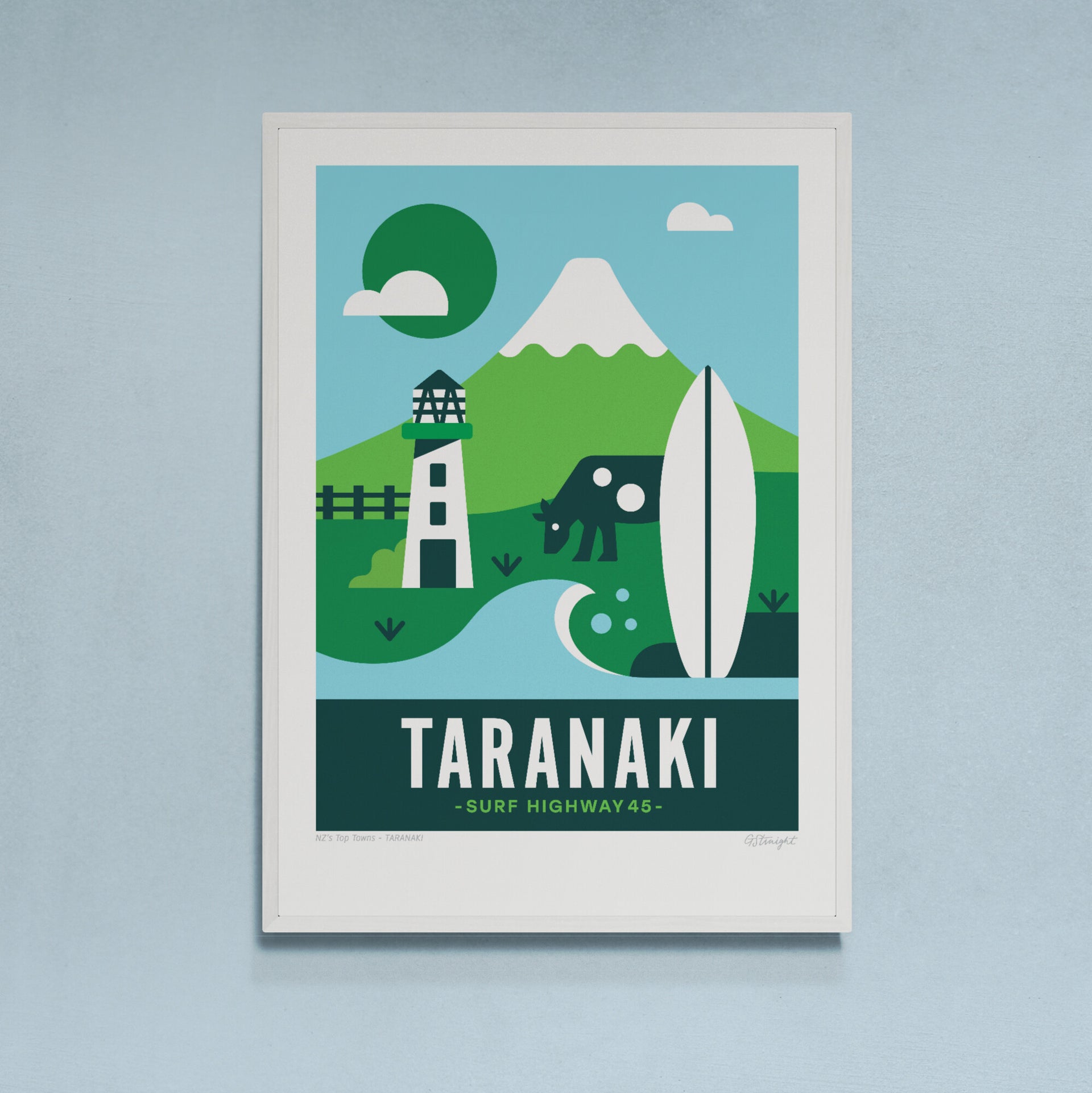 This Taranaki art print captures the region’s iconic landscape, featuring the iconic lighthouse, the mighty Mt Egmont, rolling farmland and a surfboard symbolising the Surf Highway 45. It perfectly reflects Taranaki’s coast-to-mountain character.