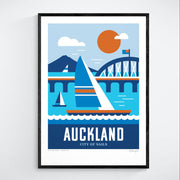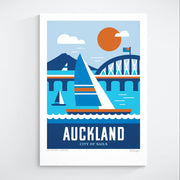 This City of Sails art print features iconic Auckland motifs, including the majestic Harbour Bridge and the distinctive silhouette of Rangitoto Island.