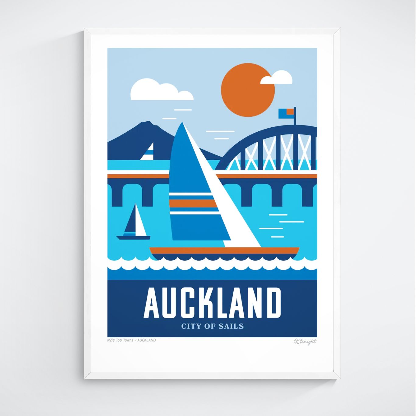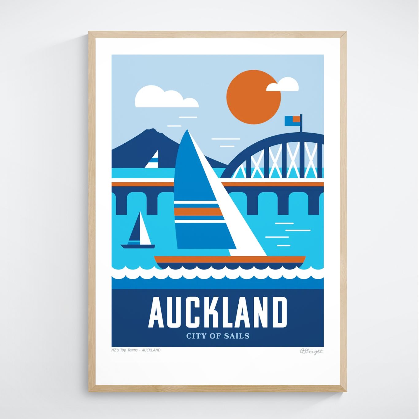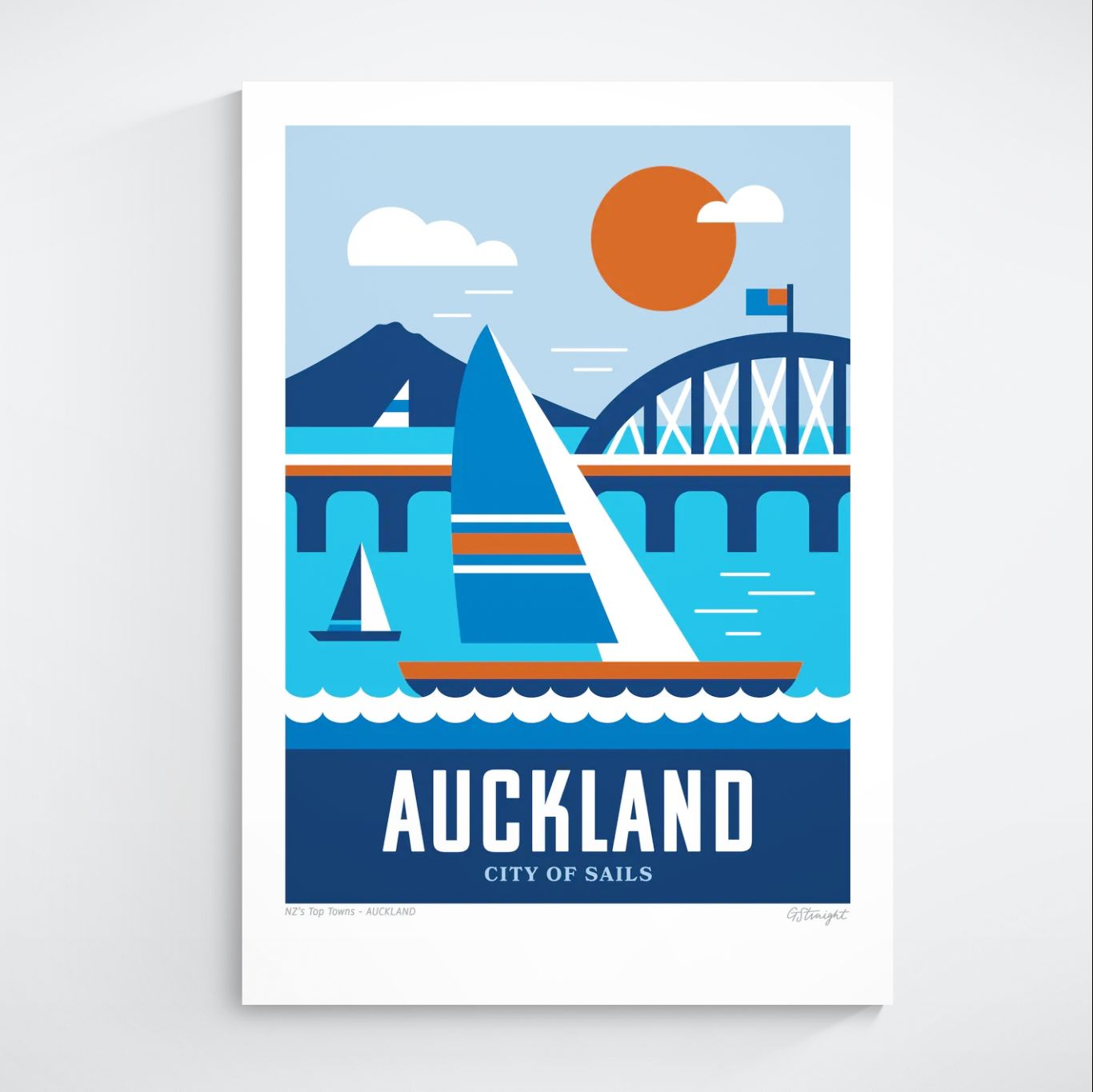 Part of Greg’s NZ's Top Towns series, this artwork captures the essence of New Zealand’s largest city, a bold and colorful tribute to Auckland’s beloved landmarks