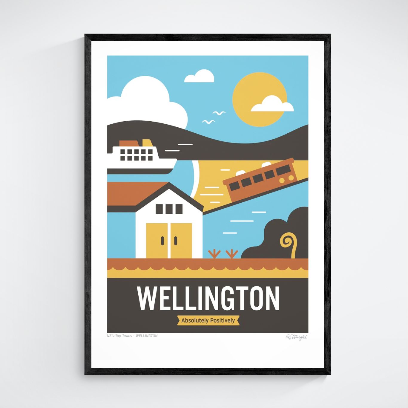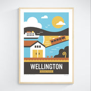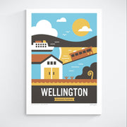 This Wellington art print captures the vibrant spirit of the capital. Featuring the iconic cable car, charming boat sheds and the majestic Interislander ferry crossing the harbour, bringing the city's landmarks to life.